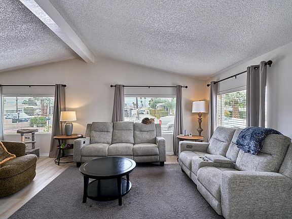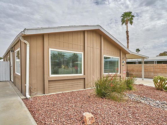 LOVELY & COMFORTABLE UPDATED HOME in Tri Palm Estates & Country Club! This beautifully updated home features a spacious living room with large picture windows to take in the panoramic mountain views. Ceilings are vaulted throughout the home for a spacious feel, and the walls are taped & textured for a more modern styling. The floorplan features both a living room and family room, along with dining room. Additional updates include laminate flooring, and a newer refrigerator with water & ice in the door. Outdoors is your private oasis with a spacious covered patio and your very own spa. And this lot is conveniently located with easy access to the community entrance/exit as well as the Clubhouse! Tri Palm Estates is an active 55+ community where YOU OWN THE LAND, and where ownership includes free unlimited golf on the 18-hole and 9-hole par-3 courses, putting green, swimming pools & spas, tennis, pickleball, basketball, shuffleboard, and use of the community clubhouse with its banquet room, bar, restaurant, billiard room and free Wi-Fi. It's near to Costco, Home Depot, the Agua Caliente Rancho Mirage Casino, Eisenhower medical campus, and Acrisure Arena, home to professional hockey and world-class concert performances. With easy access to I-10 you're just minutes from shopping, dining and entertainment in Rancho Mirage, Palm Desert and downtown Palm Springs. Come make this lovely home your new desert oasis!