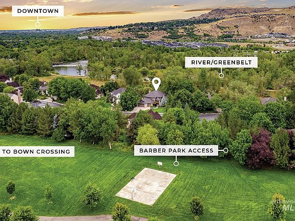 Gated retreat nestled along the Boise River in coveted Wood Duck Island! Lush setting with private back yard - sandstone paver patio, outdoor kitchen, wrap around creek & direct access Boise River/Greenbelt. Quiet cul-de-sac street bookended by Barber Park & walking distance to Bown Crossing. Light-filled entrance with sprawling hardwood floors, grand staircase & open concept living/dining rooms for entertaining. Main level executive office off the entry + main level jr. suite with full bath. Renovated chef's kitchen with floor-to-ceiling wood cabinets, central island, honed granite counters, pro-style double ovens and 6-burner gas range. Elevated primary suite boasts tree-lined views, sitting area & secluded deck overlooking the wildlife habitat. Spa-like bath with heated tile floors, double vanity, walk-in shower with dual shower heads & luxurious freestanding soaker tub. Spacious 3 car garage & fully fenced yard. Meticulous residence & unparalleled location near downtown, area schools & Boise attractions.