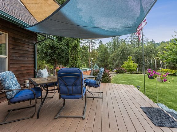 Hard to find 9.99 acres of usable Private land backed to BLM with a beautiful home and a detached guest house! This sought after neighborhood is close to both Grants Pass and Medford. Walk out your door and go hiking, biking or riding for hours on end! The Main home features an open floor plan with huge picture windows looking out onto your gorgeous views and your private gardens. The detached 2 car garage is conveniently located in the courtyard of this expansive property. You will find 3 R.V. sites! The pastures are the perfect amount of mature trees and open space and feature a small seasonal pond with 2 Seasonal creeks. The older pole barn is approx. 2376 sq.ft.!