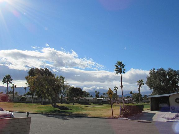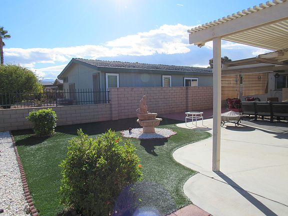 STUNNING VIEWS SURROUND YOU in this lovely contemporary golf course home in Tri Palm Estates & Country Club! Panoramic mountain views greet you above the 5th fairway, while the wraparound patio offers mountain and desert views. This lovely home has recently been updated with new kitchen appliances and roof, and features large windows to take in the scenery. The garage features plenty of storage cabinets, and there is additional storage shed as well as a golf cart garage that doubles as a workshop. The home is ideal for entertaining, featuring plenty of covered patio space with shades and misters, as well as an outdoor refrigerator, turf and water feature. The home is partially furnished (including an impressive 82'' flat-screen TV) and even INCLUDES THE 433A PERMANENT FOUNDATION for easy financing. Tri Palm Estates & Country Club is an active 55+ community where YOU OWN THE LAND, and where ownership includes free unlimited golf for 2 owners on the 18-hole and 9-hole par-3 courses, along with putting green, tennis, swimming & spas, shuffleboard, pickle ball, and use of the community clubhouse with its banquet room, restaurant, bar, billiards room, and organized activities and clubs. With easy access to I-10 you're only minutes away from the shopping, dining & services of Palm Desert, Rancho Mirage and Palm Springs. Come see the incomparable views from this lovely home, and make it your desert getaway!