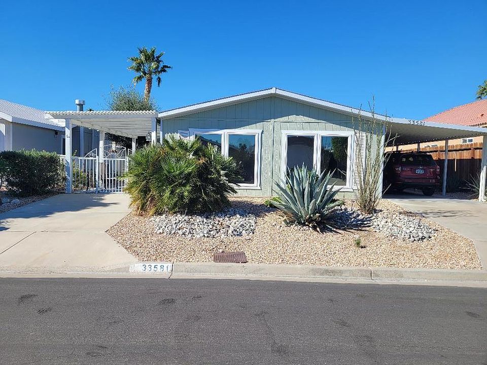 55+ Absolutely splendid home in the new section of Tri Palms Estates and Country Club!! Drywall, vaulted ceilings, sits on a cul-de-sac, comes fully furnished turnkey!!! Plus an extra area at back for sunbathing or reading. Beautiful open plan with open kitchen!! You own the land! Fully gated and landscaped. Newer washer and dryer. Low monthly HO Fee includes golf for two owners and use of clubhouse and facilities.Beautiful view of mountains. Use of two beautiful refreshing pools and spas plus clubhouse restaurant. Tri Palms is located close to all amenities including Costco, Sams, Home Depot, many restaurants, theaters, casinos and the Acrisure arena with many world famous headliners.
