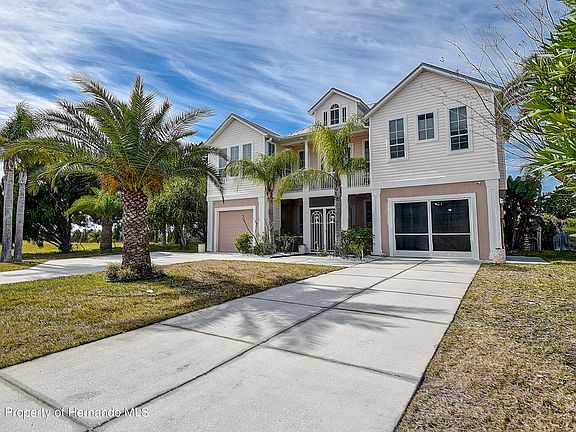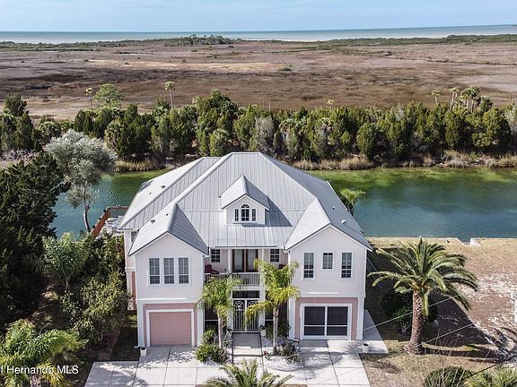 Active with contract - accepting back up offers. JUST REDUCED $50k! SPECTACULAR Waterfront Home! LOCATION, LOCATION, LOCATION! Why wait two years to build when this custom home is ready to move into NOW! Enjoy stunning panoramic views of sunsets year round on this highly desired , oversized, end of cul-de-sac location with unobstructed views of the Gulf of Mexico! Have more than one car, boat, motorcycle or storage needs? Then fall in love with the size of this garage which is the full width and depth of the house on the ground floor, able to house 4 plus vehicles and more with two separate garage doors, storage room and bathroom! All living areas are on the main floor with no need to climb stairs to a bedroom. No need to use the stairs from the entry level as there is an ELEVATOR as well. The elevator opens right off to the kitchen for convenience! This semi-furnished home has 3 bedrooms, 2 baths, granite counters throughout, electric fireplace, easy care laminate floors, impact rated windows and metal roof. Breathtaking Gulf water views from nearly every room. Private screened balcony accessed by 3 sets of French doors overlooking the water and Gulf from the grand, open concept Great room/dining room with high vaulted, Cathedral ceilings and abundant natural light front to back. Off the Great room is an open balcony facing the front for morning coffee and sunrises! The custom kitchen with white Shaker cabinets and granite island has unobstructed views to the west and open water with access to the screened lanai and open air wood deck where you can pick avocados from your own tree! The amazing master suite has access via French doors to the screened lanai as well and features two large walk-in closets with wood shelving. The Master bathroom has spectacular ''His and Hers'' areas, each side with its own vanity, shower with new frameless glass enclosures & seperate commode so no more sharing! There's also a garden tub for those who like to soak. The laundry room has oversized pantry and loads of storage cabinets, laundry tub and second fridge. Want open air dining? Then listen to the birds and enjoy the breezes and Gulf views from the private, oversized wood deck. Front entry doors lead to the ground level foyer with storage cabinets and coat closet. Metal roof! Hernando Beach South has freshwater canals that lead to the private community boat lift with access to the saltwater canal systems and the Gulf of Mexico. Low annual HOA. and no CDD. Hernando Beach South is a deed-restricted community adding to its' appeal and value. Hernando Beach has restaurants, shopping, parks, fishing, marinas and is only one hour to Tampa airport and 90 minutes to Orlando. Seller is a realtor.