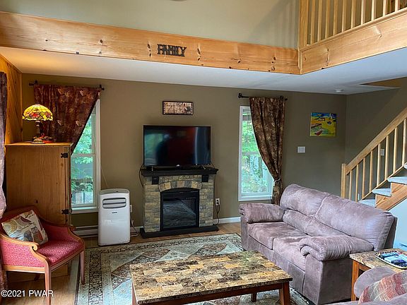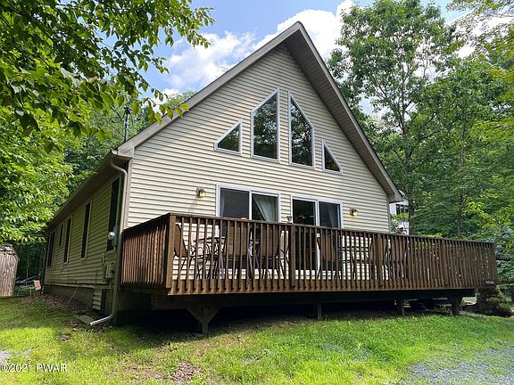 Beautiful four bedroom (Turn Key-Fully Furnished) Chalet home in an amenity filled community just an hour from the Delaware Water Gap. This home has easy access with just a few steps to get in, two master bedrooms with full bathrooms for a total of 3 full bathrooms. With the laundry room on the main floor, you could live on one level. The spacious great room has cathedral ceilings and a beautiful pine tongue and groove accent wall showcasing the large windows, and nice wooden floors. The exterior features a large deck, a nice level lot, and vinyl siding for easy maintenance. Oversized shed for storage. The amenities include lakes, beaches, pools, clubhouse with restaurant and pub, golf course, ski hill, tennis, indoor recreation complex with tennis/fitness center/arcade and more...