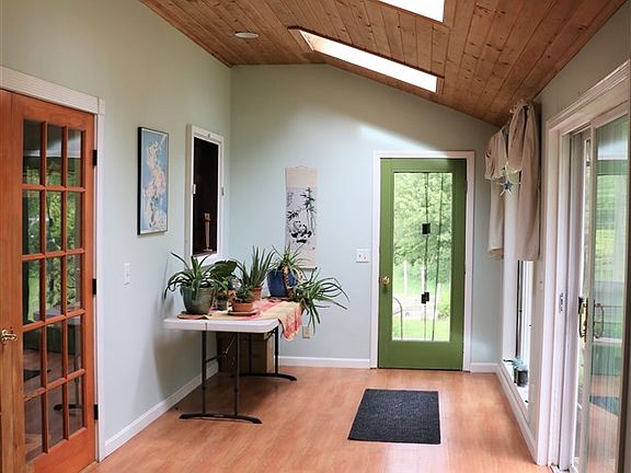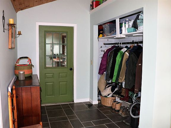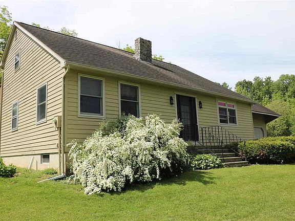 Wonderful, four bedroom, home on five acres with privacy in Monkton! Enter the home through the 2 car attached garage into a bright and cheery sunroom with a mudroom and closet space. French doors lead you into the open dining room and kitchen of the home. The kitchen has a pass through window over the sink so you can see through the sunroom into the back yard. The large living room has vaulted ceilings, a woodstove, lots of space for seating and a formal front door entrance. Two bedrooms are located on the first floor with a half bathroom and laundry. Through the laundry room has another door leading to the back yard. Two bedrooms and a full bathroom upstairs, including a master bedroom with sliding doors opening to a balcony. Outside is a back deck, covered porch, patio with a fire pit, beautiful perennial gardens, fenced in garden space with a garden shed and lots of wildlife habitat.