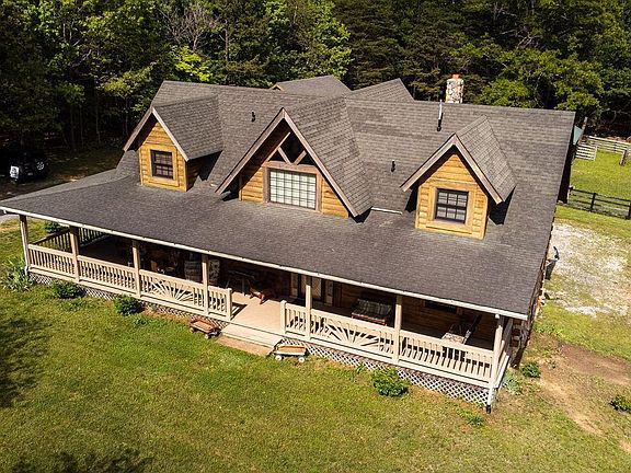 Your very own mini Yellowstone! Stunning Log Cabin on 5 +/- acres with a view of spy rock! Wrap around porch, shooting range, one sink beauty shop that could easily be a 4th bedroom with walk in closet. . 2 run in barns, fenced in area for your horse! Open living/dining/kitchen. Very private beautiful setting with a 25X30 garage with electricity and its own half bath. Lots of unfinished storage space in the basement.