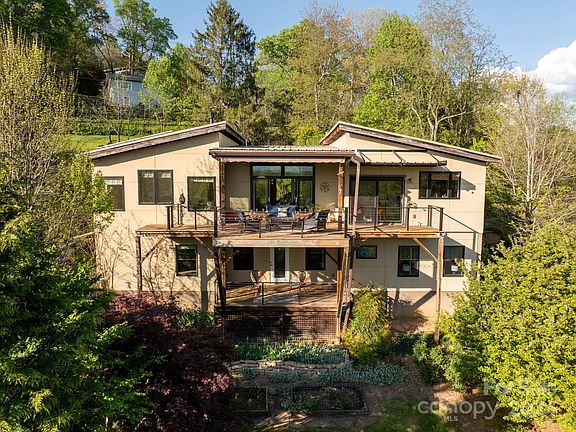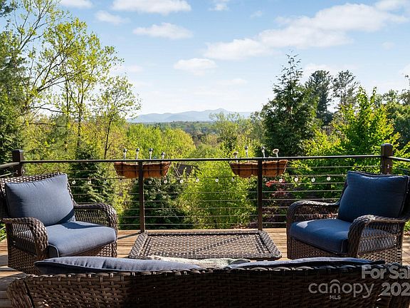 A rare find! Contemporary GreenBuilt NC Gold-Certified home in North Asheville with stunning, long-range Mount Pisgah views! Ideal location, mere steps to UNCA’s trails, campus and OLLI Center. High-end green features include geothermal and solar! Enjoy the fully fenced back yard with mature native landscaping and thought-inspiring sculptures. Designed for one-level living, enter to magnificent mountain views and a spacious open plan featuring vaulted ceilings, exposed beams, a standalone gas stove, and a large back deck. Chef’s kitchen boasts quartz counters, stainless appliances, a tile backsplash and mountain views. Sunny primary bedroom invites you to enjoy big views through oversized windows, a huge closet, and an ensuite bath that includes a natural wood vanity and a walk-in shower. Daylight basement has two bedrooms, a well-appointed bathroom and a large unfinished bonus room/workshop, perfect for expansion. The two-car carport connects to the main-level mudroom. See brochure.