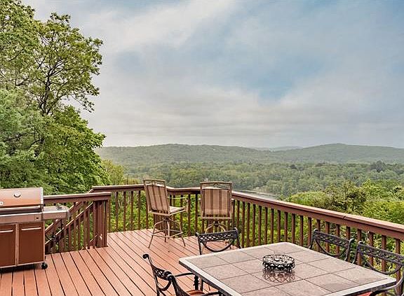 One of the most spectacular views in Ridgefield! Relax on wrap-around deck & experience breathtaking year-round scenery of Lake Mamanasco & surrounding hills. Private & secluded property backs up to wooded private land trust & far removed from the main road. Magnificent sunrises, a gardener's dream w/wild raspberries that grow abundantly in summer, Lake Mamanasco access rights, dramatic Fall foliage. Contemporary raised ranch home, w/2-car garage, versatile open floor plan, 2,290 total SF w/3 bedrooms, 2.5 baths & finished walk-out lower level. Airy living room drenched w/natural sunlight, massive brick fireplace, HW floors & vaulted beamed ceiling. Dining room w/large windows & glassed slider w/direct access to deck & its marvelous scenery. Kitchen w/parquet wood floor, plentiful cabinets, large pantry closet & updated stainless steel appliances. Hall & master baths recently w/beautiful renovations including tile flooring. Bedrooms w/HW floors. MBS open & spacious & provides 2 double closets. Tiled lower level w/wood-burning stove w/many uses. Three heat zones; basement, all bedrooms, living-dining-kit. Recent updates include bathroom renovations, new C/A, water pump, water softener, painted exterior & deck & paved driveway. This very special property offers the best of all worlds: exceptional privacy in a beautiful setting and convenience to both the charming town of Ridgefield and Metro North train service to New York City via the Goldens Bridge or Katonah stations.
