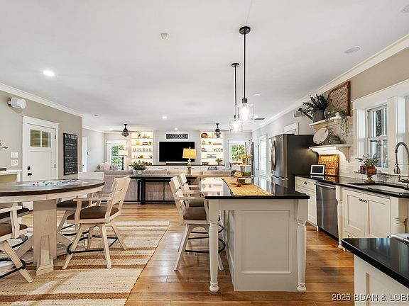 This fully remodeled home offers the perfect blend of privacy and luxury with its own entrance, chilled & heated pool, and quiet cul-de-sac location in the desirable Osage National Golf Community. This home welcomes you with warm woodwork, hardwood floors, and quality finishes throughout. The kitchen features a gas range, double oven & glass-front cabinetry, plus a breakfast nook and cozy hearth room. Enjoy mainly 1-level living with 3 total living areas, a guest suite upstairs, a mudroom with built-ins, a screened porch, a large open deck & 3-car garage with flat drive and yard. The floor plan of this home is a dream come true. You can also take your golf cart to enjoy the zero-level entry pool, golfing, and then even have lunch or dinner at the Eagle View Bar and Grill. The neighborhood enjoys community nights and get-togethers. 2 crawl spaces, 3 HVAC systems, 2 gas fireplaces, road access, outside repainted, new cabinets, new tile, high-speed internet (business charter), sits on 2 lots, new roof in 2025, fenced yard & 5,400 sq ft. Marinas only 6 minutes away if you want to keep a boat close by. New Roof July 2025.