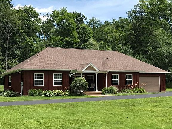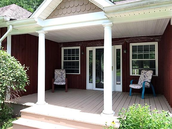 Nearly 2300 s/f of stately sophistication radiates from this sprawling cedar contemporary on 4.2 country acres spanning Mahoning and Pulaski Townships. Commanding Tuscan columns anchor the covered open front porch extending a cordial welcome through a decorative glass front door flanked in sidelites into an elongated entry underscored in ceramic tile and perimetered in attractive wainscoting overlooking a well-designed free-flowing layout. Vaulted ceilings and recessed lighting radiate depth and elegance in the entertainment-friendly living room accentuated by a floor-to-ceiling stone fireplace and patio doors lending access to a sun-infused 3-season room transitioning out to an expansive rear deck offering wide-eyed views of the private wooded backdrop through triple sliding doors. Meal prep is easy in the streamlined galley-style fully-equipped kitchen underscored in ceramic tile and showcasing abundant white cabinetry, coordinating ceramic backsplash, contrasting counters, eat-at serving peninsula and an intimate dining venue illuminated by a sunny angled wall of windows. Gleaming hardwood compliments adjacent formal dining room accented by lighted wall sconces, wainscoting and modern chandelier. Unique design owners suite features an open concept bathroom hosting his and hers sinks, shower, jetted soaker tub encircled in ceramic, and walk-in closet giving the bedroom a greater sense of space while inviting the outdoors in through a sliding door to the rear deck. Split bedroom design features 2 more sizeable bedrooms on the opposite wing straddling another full bathroom and a bonus room/den. A conveniently located powder room and laundry completes the main level. Full basement flaunting high ceilings and interior French drain waterproofing system can be easily finished to double the living space! Newer roof, furnace, air, paved governors driveway.