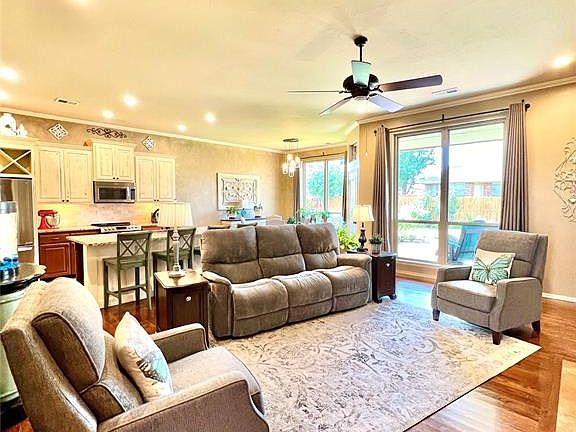 Welcome home!This home has been well loved and cared for through it's ownership. You will love the open kitchen/living space. Beautiuflly landscaping with so many flowers, trees and bushes that you can enjoy all year round. The primary bedroom is spacious and is definitely a space you will enjoy. The primary bathroom has been totally remodeled. The kitchen has been remodeled with new appliances. The inside of the house has all been repainted. Outside exterior was painted about 6 years ago. Fence is brand new. There is hardwood floors and carpet along with tile The HOA dues include the club house, rec facility and the pool. You will love the look of the beautiful fireplace that is the center point of the living room. The patio is covered and a large space for outside furniture. There is a large inviting porch to your front door. There is a storm shelter in the garage floor. The cul de sac is like a family and have many fun activites through the year. Come check it out and make it yours today!
