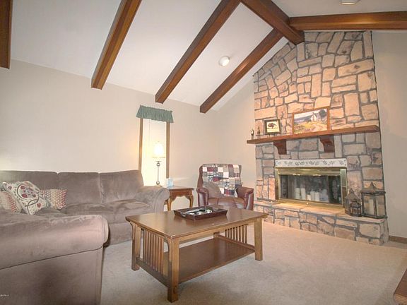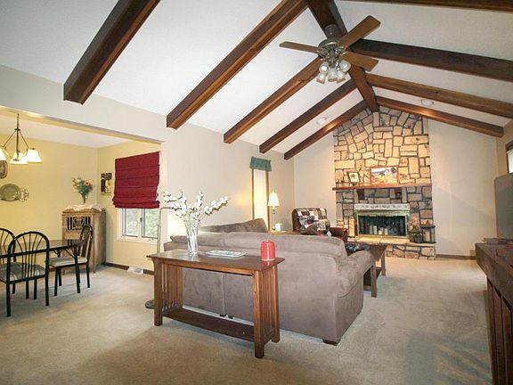 This gorgeous updated ranch is nestled on a quiet cul-de-sac street. Step inside to wood floors and a soaring ceiling with rustic wood beams that would make any designer proud. The spacious living room with new carpet has an impressive bricked fireplace. Dinners can be a formal occasion in the dining room or step into the delightful eat in kitchen with sleek stainless steel appliances, pantry and tiled backsplash. There are 3 perfectly sized bedrooms, main level laundry and a master suite with walk in closet. Entertain in the sizable family room with classic wet bar, half bath and a 2nd fireplace. The stylish deck feels very private and overlooks the landscaped fenced yard. There's plenty of room to shoot hoops on the large concrete driveway. This immaculate home will not last long.