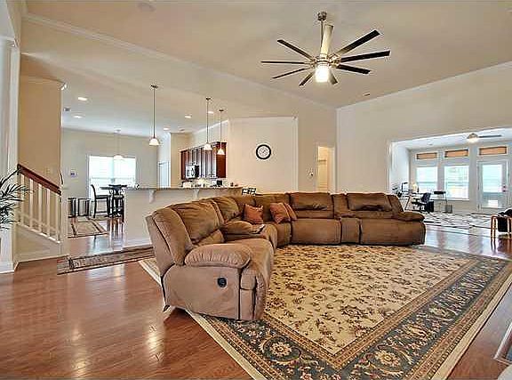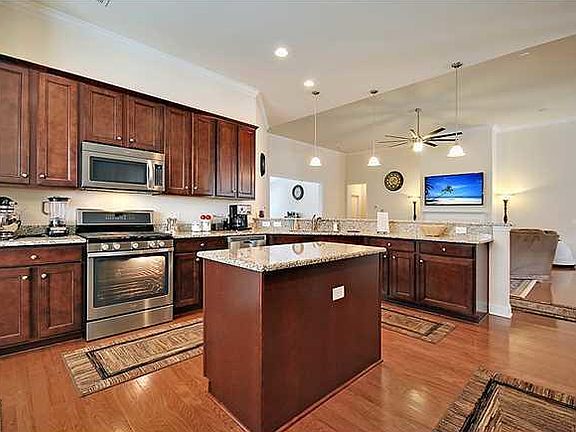 Take a look at this is a beautiful hard to find large single story Nantucket design with all the features you've been searching for. They don't build this great plan anymore so you are in luck! This home has up to 5 bedrooms which include 2 true master suites each with large master baths. All bedrooms are separated giving a feeling of privacy. One of these rooms is presently used as a gym and another is the FROG/bonus room upstairs. As you walk through the front door you'll find beautiful hardwood floors that flow through all the living areas downstairs. All bedrooms and the bonus room are carpeted with the bathrooms and very large sun room having ceramic tile. Enjoy surround sound in the spacious living room where wiring is already in place for you to hang your TV above the gas fireplace. The large dining room also has a lovely tray ceiling and adds to the large open layout of this home. Gourmet eat in kitchen with quality stainless appliances including a gas range. There's plenty of granite counters and lots of extended 42'' cabinets with pull out drawers in lower cabinets. There's even a big center island and pendant lights in addition to the canned lighting. The master suite is large, has a triple tray ceiling, surround sound, his and hers closets and a luxury bath. This great bathroom has a large round soaking tub, big shower and separate vanities.There's a bonus room upstairs that could be a bedroom, get away for kids or maybe an office or craft room. The fenced backyard backs to a wooded buffer providing extra privacy. There are many upgrades including trimmed out windows and doors, window blinds throughout, Lots of crown molding throughout the house, an alarm system, irrigation system, storm doors front and rear, a matching storage shed in the backyard and much more. There's a gate on the back fence that leads to a grassy field that overlooks the pond just beyond. Cane Bay is a very popular community with popular schools and nice amenities including a neighborhood pool and pavilion. Why build when you can have it now? fireplace. The large dining room also has a lovely tray ceiling and adds to the large open layout of this home. Gourmet eat in kitchen with quality stainless appliances including a gas range. There's plenty of granite counters and lots of extended 42'' cabinets with pull out drawers in lower cabinets. There's even a big center island and pendant lights in addition to the canned lighting. The master suite is large, has a triple tray ceiling, surround sound, his and hers closets and a luxury bath. This great bathroom has a large round soaking tub, big shower and separate vanities.There's a bonus room upstairs that could be a bedroom, get away for kids or maybe an office or craft room. The fenced backyard backs to a wooded buffer providing extra privacy. There are many upgrades including trimmed out windows and doors, window blinds throughout, Lots of crown molding throughout the house, an alarm system, irrigation system, storm doors front and rear, a matching storage shed in the backyard and much more. There's a gate on the back fence that leads to a grassy field that overlooks the pond just beyond. Cane Bay is a very popular community with popular schools and nice amenities including a neighborhood pool and pavilion. Why build when you can have it now?