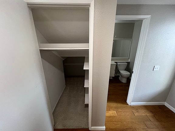 The upstairs area contains both bedrooms, the hallway bathroom, and additional linen cabinetry.