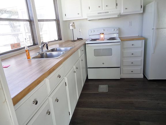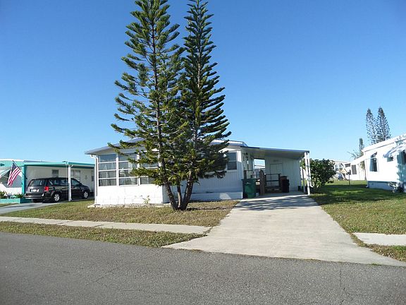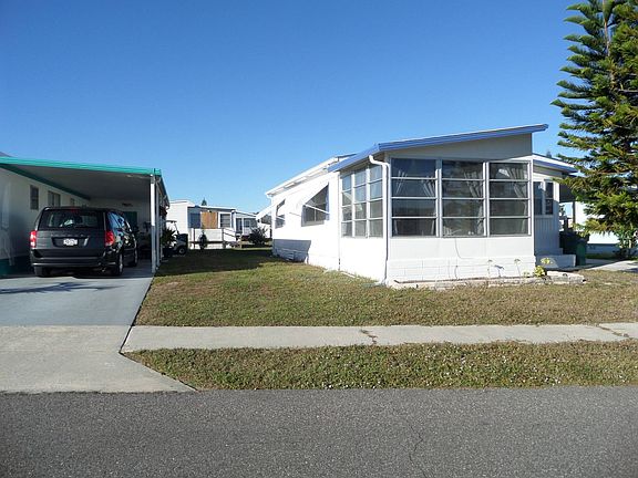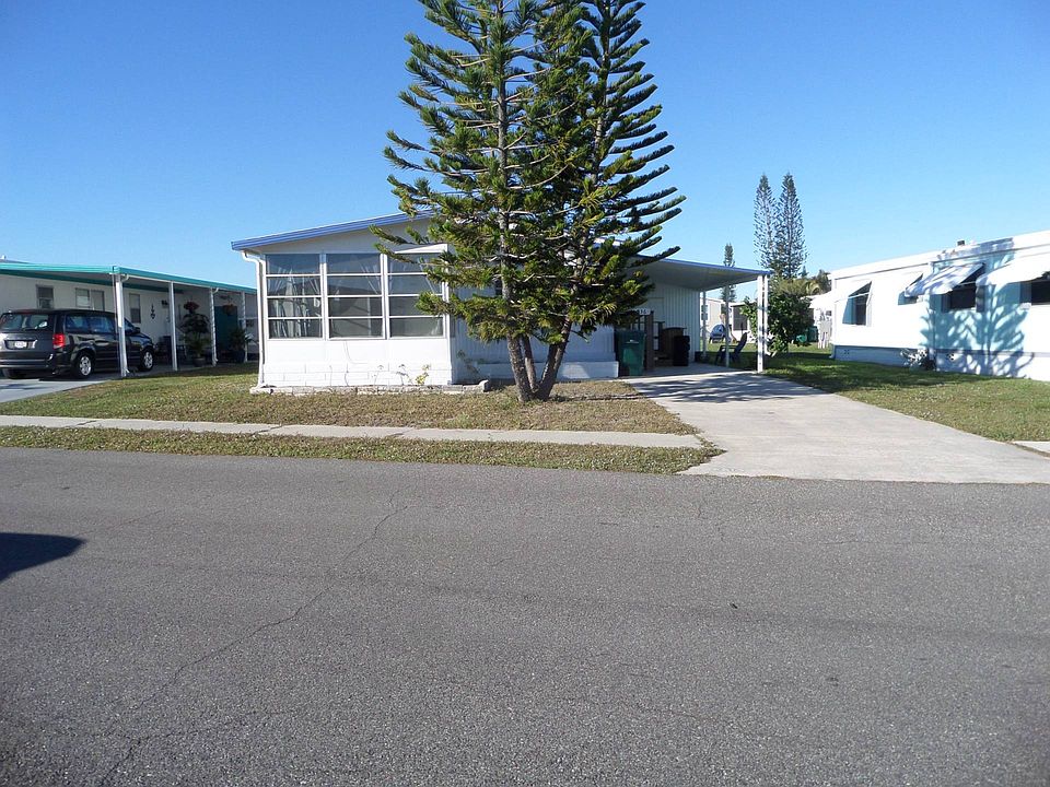 Enter the home, with newer A/C, from under the carport into the cozy eat in kitchen with Lots of cabinets and drawers. Double stainless sink, electric stove and fridge. Good size pantry and smaller dining area. Notice all new flooring throughout, no carpet. The wood paneling has been replaced with drywall and drywall was installed on the ceilings. There is also a new electrical panel as well. Large living room with sliders leading into the enclosed sun room. The sun room is fully screened with glass windows and a door to outside. A great place to relax and read a book or entertain friends and neighbors. In the hallway find a convenient linen closet right across from the large bath. Bath has a shower / tub combo, newer commode, long vanity with storage below and two tall storage cabinets on either side of the mirror. Good size primary bedroom with double closets and smaller guest room with a large closet. Could also be a great home office. Home is very easy to keep clean and tidy. Back outside find an over sized storage shed / laundry room and YES the Washer and Dryer STAY!!! Lakewood is a Great 55+ community, with lots of friendly neighbors. Lot rent includes Water, Sewer, Garbage, Taxes and use of all the many amenities. Heated pool to use year round. Large clubhouse with activities every month. Clubhouse includes library, card / game area, billiards, and fitness room. Be as busy as you want or do nothing at all.