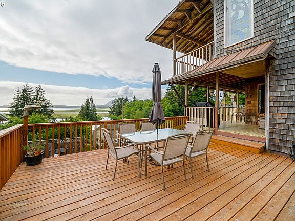 A coastal retreat with expansive views of Nehalem Bay, Neahkahnie Mountain, and the ocean from high atop the hill in Wheeler, Oregon! This charming home is on a quiet street with 2 beds/2 full baths, + 1 non-conforming bedroom on the lower level for added flexibility. Enjoy the large primary suite occupying the entire upper level, offering breathtaking views, a large walk-in closet, en-suite bathroom, and room for an office, art studio, or additional living space. Recent updates in 2023 include a kitchen remodel and a 20x18 deck ideal for entertaining w/panoramic views. Additional amenities include a cozy woodstove, a heat pump w/forced air heat & AC, covered boat or 2-car parking, a detached shop (approx. 500 sf) with loft storage, multiple covered decks, a fire pit, a mole-proof garden + greenhouse with catchment water system, and a soothing water fountain. All this just blocks from town, on .18-acre with ample space for the whole family.