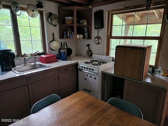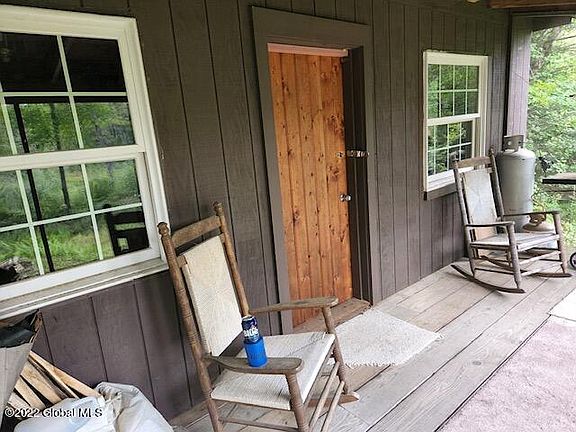 Super nice secluded camp in the woods. Has propane stove and refrigerator, 12v lighting supplied by battery with solar pannel charger, and an indoor porcelain toilet with rain barrel to supply water to toilet. Property is being sold as-is cash only. Built in 2009 and is well built to hold plenty of snow load. Property has a very nice view out back of woods and pond with over an acre of land.
