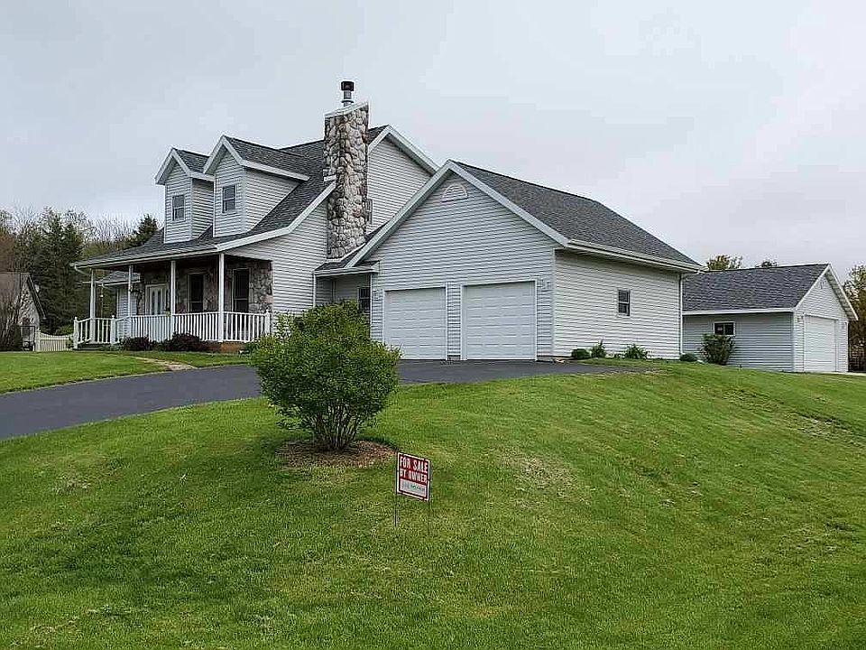 Exceptional property with three levels of living space! This 3BR, 3BA home features open concept, main floor master, main floor laundry, finished basement, attached two garage plus 2 car detached garage. Inviting front porch, hardwood floors on main, and stone-faced fireplace. New roof in 2017 and newer furnace and water heater. Egress window in basement for a potential 4th bedroom and bonus room upstairs. Situated on 0.4 acres on a cul-de-sac.