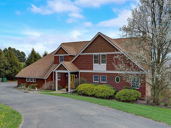 Built by American architect Robert A.M. Stern this custom home. A long driveway leads to this lovely, private home boasting amazing curb appeal with gables & gorgeous landscaping. Upon entering you'll find a welcoming foyer that leads to an expansive main living area with a wood-burning fireplace & open stairwell brightened by windows on both floors. The Eat-In Kitchen is fully equipped with a double oven, updated stainless fridge & center island. The main floor Primary Bedroom Suite features a vaulted bedroom with walls of windows boasting serene views, a walk-in closet, ensuite full bathroom & a separate room that can be an office or 4th bedroom. The upper floor offers 2 additional bedrooms & a full bathroom. The finished lower-level provides plenty of additional living space, plus a workshop/storage area. Enjoy breathtaking views from huge rear porch overlooking professional landscaping, hardscaping & retaining wall. Located in Seneca Valley SD.