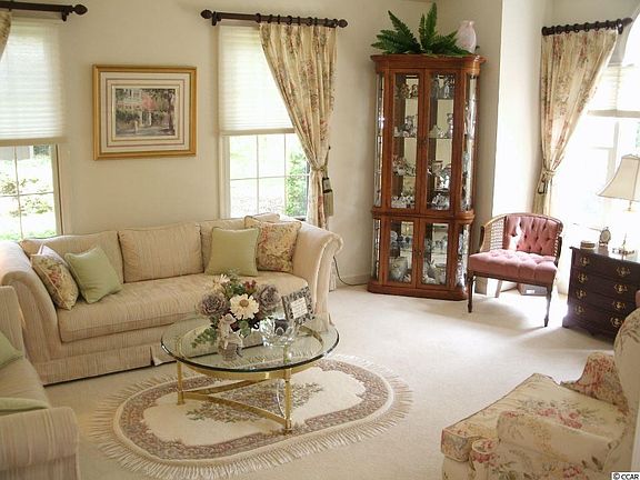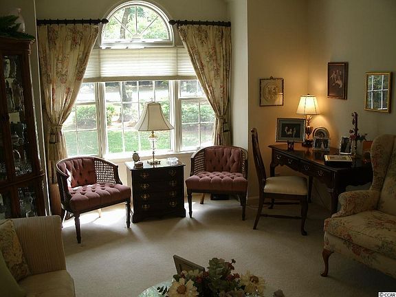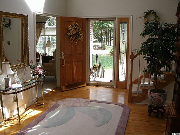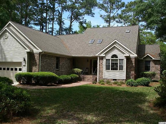 Exceptionally well maintained two-story home offers smart layout and choice golf course setting framed by mature live oaks. Boasts vaulted ceilings, immaculate hardwood floors, fireplace, screened porch and sun deck. Main floor has formal living room, formal dining room, and den that shares open concept space with kitchen. Large eat-in kitchen offers plenty of counter and cupboard space. Master suite located on main floor as well as second bedroom currently being used for study. Two and a half baths on main floor. Two bedrooms and full bath on top floor along with spacious climate controlled storage area that could easily be converted to fifth bedroom. Convenient to shopping, schools, restaurants, public parks, and boat access to the Waccamaw River. Quick and easy access to the beach. Priced to sell.