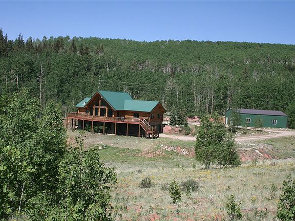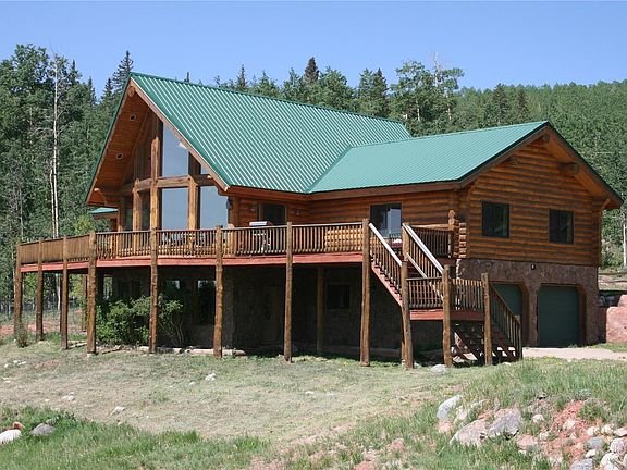 Classic Colorado log cabin on 5.52 acres. Spectacular great room with T & G cathedral ceiling, large wall of windows & log staircase. Main level master suite with spacious bathroom, jetted tub and 5 piece bath. Upscale kitchen with new appliances, granite countertops and wine rack. Wood floors on main level & loft. New carpet in upstairs bedrooms. Lower level has concrete stamped floors and In-floor radiant heating including in the attached 2+ car garage. Lower level includes second kitchen and dining area. Detached 1,500 square foot metal garage/shop with 9 foot doors. New septic tank installed a couple years ago. New decking installed on main level deck two years ago. Outdoor wood furnace plumbed to central boiler. Separate laundry room. Loft could be used as an office or bonus room. Private decks off the master suite and loft. Wells permitted for outside watering and 2 horses. Miles of National Forest just up the road. Private fishing in stocked subdivision pond. Great Place.