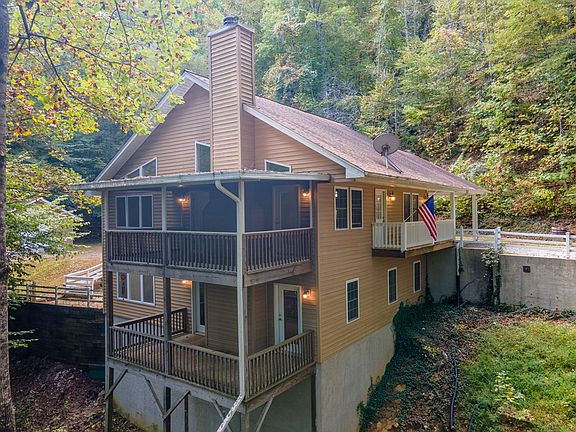 Off the beaten path, this home is tucked away in a private setting; sitting on the upper deck, you may even feel like you're living amongst the trees. This home has great space to enjoy the NC weather and watch the deer walk through the woods. With fresh paint and new carpet, you're ready to move in. Enter from the covered carport into the kitchen, or through the front door into the living room with vaulted ceilings, wood burning fireplace and doors to a screened in deck. Large main-level master bedroom with huge en-suite bath: soaking tub, shower, closet & dual vanities. Main level guest 1/2 bath is down the hall as well. Downstairs you will find a family room with gas fireplace and 2 doors accessing the lower deck, another large bedroom, full bath, two bonus rooms that could be used as offices, playroom, additional living space and large laundry room. Small fenced area in the back. Workshop with loading dock and additional storage in the back as well. Minimal yard maintenance. Great location convenient to Georgia and Franklin!