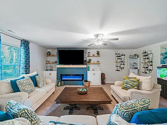 The main living area boasts built-in shelving surrounding a beautifully designed electric fireplace with remote control. The laundry room has a shelving unit to hold your laundry baskets, a laundry sorter, along with a washer and dryer for your convenience.