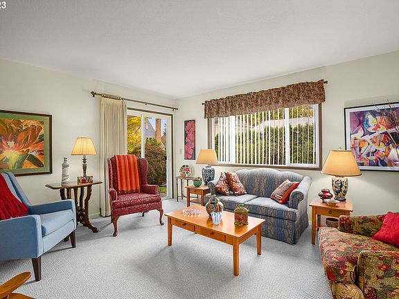 Charming & unique one level end unit with covered back patio. Interior just painted white. See photos new interior paint. Patio opens to private landscaped garden yard with shade tree. New counters in kitchen with skylights opens to dining & living room with gas fireplace & slider to patio. Master bedroom with attached bath & 2nd full bath in hallway. 2nd bedroom or office with slider to patio. Refreshed interior paint. LVT flooring & some carpeting. High efficiency gas furnace & vinyl windows. All appliances + washer & dryer are included. This one can be a rental. AHS Home Warranty. Professionally cleaned. Remaining art & furnishings for staging belong to seller and are not for sale. PLEASE USE BOOTIES.