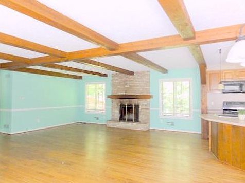 ONE LEVEL LIVING WITH OPEN FLOOR PLAN PLUS A FIRST FLOOR LAUNDRY. Brick and vinyl ranch on quiet dead end street and lovingly cared for by long time owner. Huge great room, kitchen with center island (all appliances remain), formal dining room and fireplaced family room - terrific for entertaining. Both bedrooms have private baths. Deck overlooks private rear yard backing to woods. Watch the world go by from the delightful front porch. Roof is 3 years old.