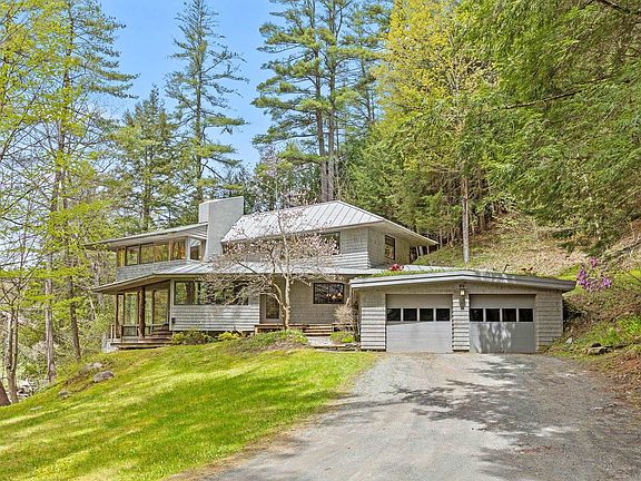 Inspired by the Prairie Style architecture of Louis Sullivan and Frank Lloyd Wright, the circa 1998 Thomas House, designed by Daniel Johnson, is a singular residence that incorporates the elemental power of native stone, wood, glass, and water to create a connection to nature not found in the design of traditional New England homes. Upon its completion, the home was hailed as having brought modern architecture to Norwich. The setting and the convenient location, hidden in plain sight just a short distance from the center of the Village, are key ingredients in the property’s appeal. Rising above the banks of the Blood Brook, the home's orientation takes in the visual and auditory flow of the falling water below. An open-concept floor plan and a sense of space and volume combine to create dramatic interior spaces that bring the natural world inside. An open entry/kitchen/dining area, living room, first-floor primary bedroom, two additional bedrooms upstairs, two and a half baths, and ample studio/office space complete the interior. A two-car attached garage with a ‘green roof’ - well ahead of its time - provides direct entry and storage. Minutes to Dan and Whit’s and every Upper Valley location while providing a refuge of peace and tranquility, the Thomas House offers a direct and immediate link to the natural world in the center of it all.