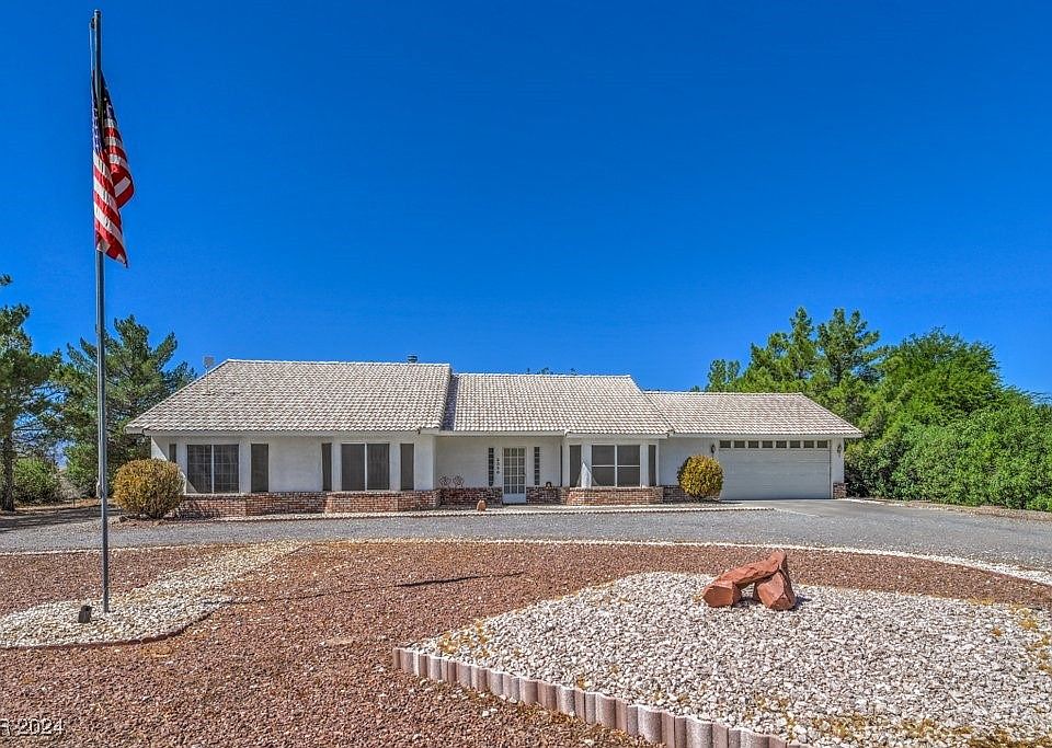 Stunning, secluded, fully-fenced, 1.14-acre property for sale in Pahrump, NV. You must view to see everything this home & lot have to offer. Well-kept and professionally irrigated mature landscaping (Oleanders, Pines, more). Newly remodeled primary bedroom/bathroom, & new flooring installed over the summer. Beautiful natural lighting throughout custom built home. Vaulted ceilings & a breakfast counter that seats 6. 2-car garage with half-bath. Separate laundry room with built-in cabinetry. Covered RV parking and hook-up, & covered back patio area frequented by hummingbirds, complete with above-ground fiberglass spa. Electronically double-gated entry. Private well (no water bill)! Unfinished ~350sqft casita on side of property. DO NOT miss this opportunity on a one-of-a-kind dwelling!