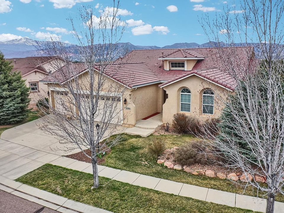 Experience the Pine Creek lifestyle in this gorgeous walkout ranch style home w/ stucco exterior & tile roof situated on a prime lot with amazing views of Pikes Peak and the entire front range. Stylish main level living starts at the curvilinear foyer w/ hardwood floors and continues into the large living room. A wall of windows showcase the view, and a gas fireplace creates a cozy atmosphere. The walkout lower level features a light and bright family room w/ a built-in entertainment area where the TV & sound system is included. There is an extension of the family room that has a long dry bar perfect for entertaining or storage. There is a full bathroom & private bedroom beyond the bonus room making it a wonderful private retreat. Outside, the fenced in patio makes a perfect dog run area. Enjoy the Pine Creek Golf Course, nearby shopping and dining, and prime D-20 schools.