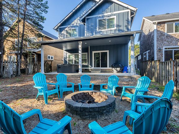 VERY NEW 2-STORY in ideal location backing up to wooded government land for your family enjoyment, and across street from beach trail. Located only about 300 yards to Pacific City's long sandy beach & fabulous restaurants. Sold furnished! 5 large bdrms & 3 full gorgeous baths, open concept greatroom which looks out to covered patio with 8x8 hot tub and the gentle deer grazing in the woods. Granite kitchen, stainless appliances, farm sink, LVP flooring, huge tiled shower in master bath, coffered ceiling in primary bdrm. Fun bunkroom with 75'' TV. Ground floor bdrm/bath. Beautiful white brick fireplace in greatroom & firepit in backyard invite intimate & memorable gatherings. High efficiency heat pump for summer cool and year-round economy.