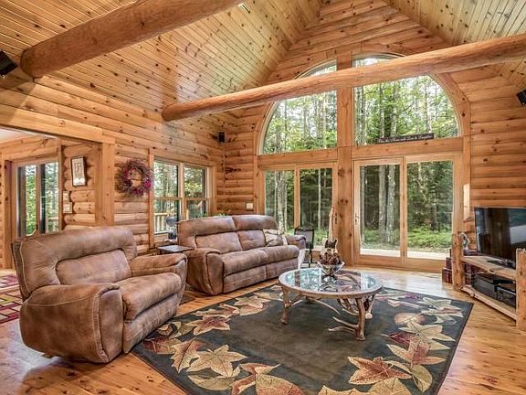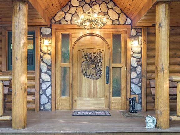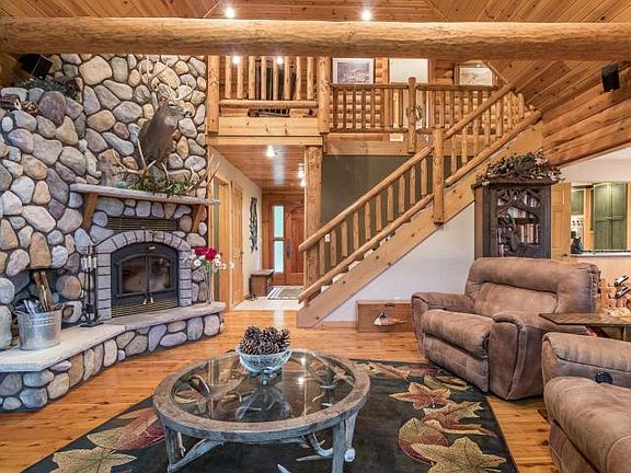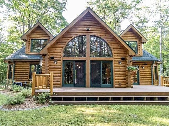 Featured in Log Home Living magazine! Exquisite custom built log chalet nestled privately on a wooded 14.16 acre parcel. Peace and tranquility located only 5 miles East of Eagle River. Amidst the abundance of wildlife, the impressive Northwoods log chalet is positioned peacefully on an oak ridge outlined by mature pine trees. Greeted by the charming covered front porch, take note of the spectacular custom-engraved entry door. Breathtaking first impression of the great room, which boasts a wall of windows, soaring ceiling, Australian Cypress flooring & WB stone fireplace. Designer kitchen features Viking appliances, corian counters & custom cabinetry. The floor plan offers a spacious main floor master suite, 2nd level includes two add'l bdrms, fireplace, office/loft & full bath. Full basement is partially finished w/ a workshop, bonus room, exercise area & 4th bathroom. The 28'x44' detached garage has 4 overhead doors, insulated & was designed with a boat drive-through!