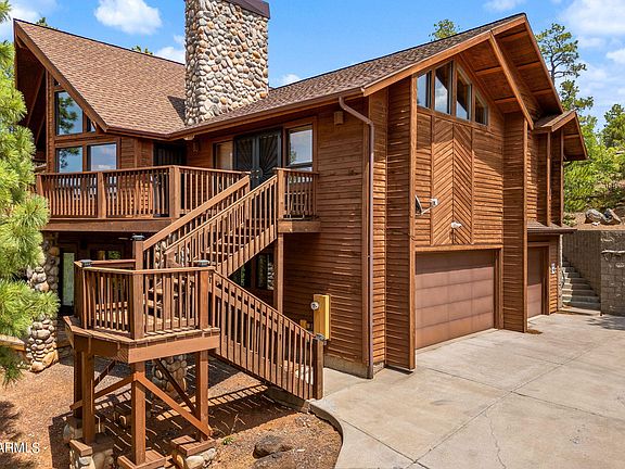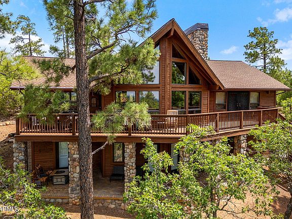 Every room in this Torreon cabin offers breathtaking views of Show Low, whether from the upper or lower deck. Perched on a .95-acre lot within a prestigious gated community, this hilltop retreat combines unparalleled natural beauty with modern luxury. As you enter, you'll be captivated by the panoramic vistas that stretch as far as the eye can see. The cabin's lodge-inspired ambiance features soaring vaulted ceilings with rich wood paneling, and a stunning stone fireplace that adds warmth and elegance. Expansive floor-to-ceiling windows frame the serene surroundings, creating a tranquil escape. The master suite on the main floor offers a serene haven, perfect for unwinding and reconnecting in this exceptional property. of cabin charm and modern convenience. The lower lever had generous sized bedrooms boast private access to the lower deck, ensuring everyone has their own space to relax. An additional expansive room currently serves as a multi-purpose haven, comfortably accommodating two sets of bunk beds with trundles. The spacious three-car garage boasts a dedicated hangout zone complete with comfortable seating, foosball and ping pong table. Step outside and embrace the true mountain experience. Expansive decks on multiple levels provide ample space for outdoor living, while a private trail leads directly behind the cabin to a breathtaking 3-acre common area with stunning mountaintop views.