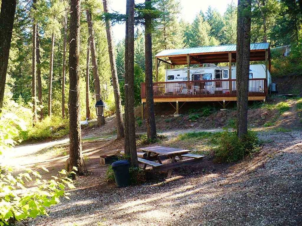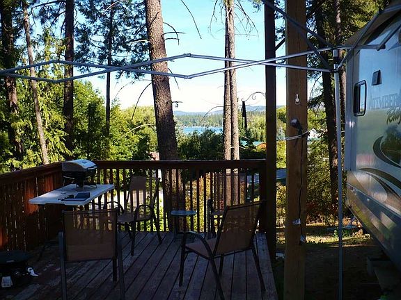 Waitts Lake View. Double lot, gated circular driveway. Professionally constructed deck & snow roof over a 2013 32' Timber Ridge travel trailer. The views from the deck / property of the forest and lake will inspire serenity. Amenities include storage shed, public water (balance owed $3,500) and Avista power (installed). Sewer available for hookup for a fee (apx $6,500.) from Stevens PUD. 2 minute level walk to private association beach and dock & close to public boat launch. What are you Waitt-ing for?