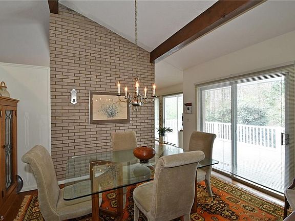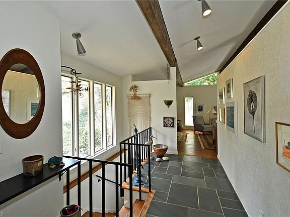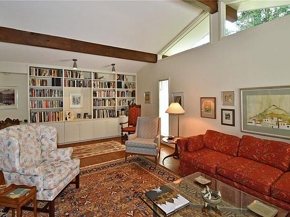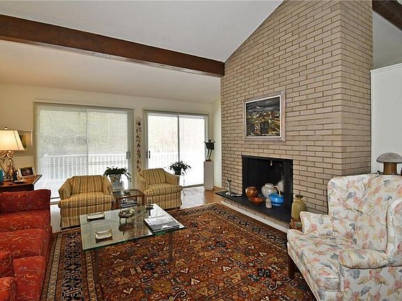 Don't miss this one owner, custom-built home w/a lovely contemporary flair! Filled w/natural light & distinguished by vaulted ceilings w/exposed beams, this home pairs artistic design w/inviting functionality. Magnificent views of backyard fairyland from abundant glass in great room, DR & kitchen. Cozy b'fast area w/skylight opens to generous composite deck. Master BR & 2 add'l BRs on main level. LL includes den w/fp opening to patio; playroom & 4th BR w/bath. Circular drive & abundant storage.