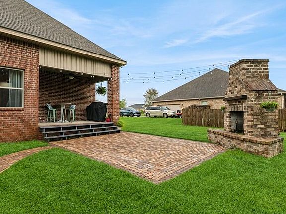 Kitchen includes islandMature treesMaster suiteMedia roomBrick patio with fireplaceBuilt-in basketball hoopGarden tub