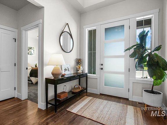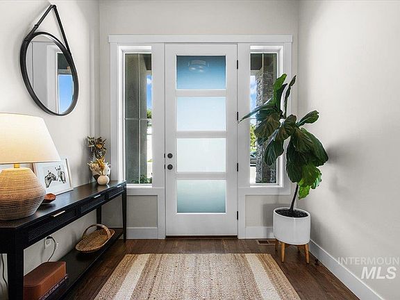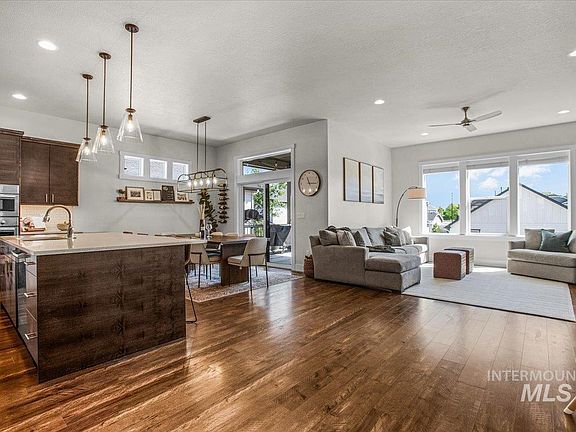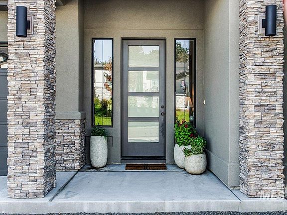 A modern single-level home with luxury finishes, located in Meridian's Timberline community. Its elevated split-bedroom floorplan offers a spacious great room with delectable natural lighting spilling in from the oversized windows, while high ceilings and custom shelving framing the fireplace highlight the home's elegant design. The open concept flows directly into the entertainer's kitchen featuring built in stainless-steel Bosch appliances, stunning quartz countertops, oversized island and dining space. This 3-bedroom, 2-bath property features LVP flooring, walk-in tiled primary shower, dual vanities, covered outdoor patio space, garden boxes, new water heater installed 2023 and a built-in tech-office. The 2.5 car garage provides additional space for yard tools or home gym. Newly constructed 300 sq ft storage room allows ample space to perfectly organize belongings. This is a perfect home to call yours!
