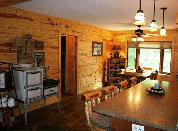 Totally remodeled Stark Lake W/O with open floor plan, gas stone F.P. lots of Knotty Pine, large lakeside deck, lower level screened porch, wood stove, wet bar, sauna, Lakeside patio with outside F.P. easy elevation to lake, great swimming, sandy beach.