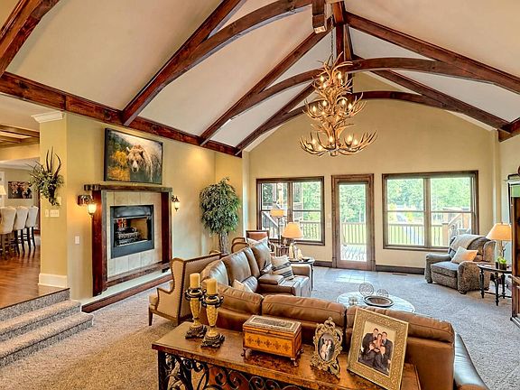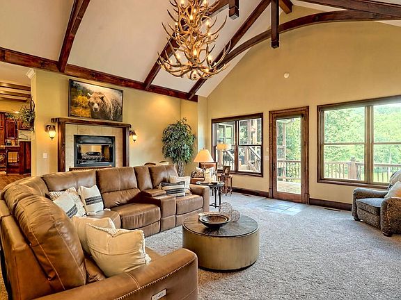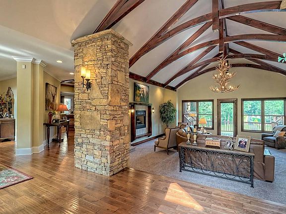 Please view virtual tour links. From the moment you pull through the gate you will admire the beauty of this creek front property and the mountain views. This beautifully appointed Craftsman home with custom upgrades on 20+ acres features 4 bedrooms, 4.5 baths and a large 3 car garage. There are two Master en suites on the main level. Main master has gas log fireplace, sitting room/study and his & hers walk-in closets. 2nd master has sitting room and large walk-in closet. Third bedroom and another full bath on main along with dining room, great room with vaulted ceiling and two-sided gas FP which is shared with the large gourmet kitchen and breakfast room which features coffered ceiling and access to decks for outdoor dining and entertainment. Family room has copper tray ceiling, wood burning FP, a large custom wet bar and bath and access to the two decks. Large laundry room with cabinetry & farm sink on main. Upstairs is another suite and large storage room. Nice mountain and creek views from most rooms in the home. Large 2 story barn with several acres of fenced pasture for cattle or horses. Listing includes parcel #0046037A which has a new building with gym but could be converted to a guest house, a pond with fountain and dock, all of which are connected by a bridge across the creek for easy access to both properties. Mountain living at its finest!
