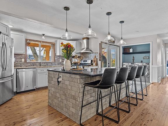 Striking stone wood-burning fireplaceNewer roofHorse stalls and corralsAbundant irrigated landStainless steel appliancesSolid-surface countertopsChicken and turkey coops