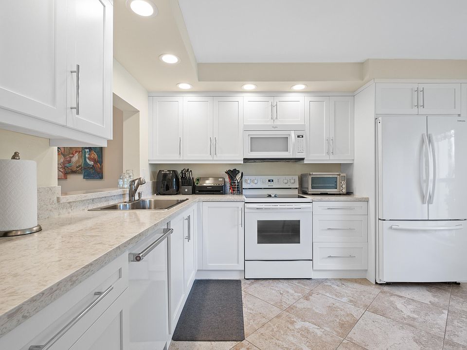 First Flr Lakefront totally updated Beauty! White-on White Eat-in Kit, Designer Cabinets, Recessed Lighting, Quartz Counters, Pantry w/Pull-Out Shelves!. Formal Dining Area, & Spacious LR w/Dbl Sliders to Patio overlooking Lake w/Fountain. Peace & Tranquility abounds here!!! Both Baths updated w/Quartz Counter Vanities, New Ceramic Tile ''Wood Look Flooring'' which is also in Both Bdrms. Mstr has Walk-in plus 2nd Closet. Guest Bdrm also has Walk-in Closet. Windows & Sliders have Decorator ''Zebra Style Blinds''. New Roof,...A/C & Hot H20 2023! HOA Incl. H20, Cable & Internet. Resort -Style living at Active 55+ Park Pointe w/ Clubhouse, Many Activities, Shows, Clubs, Gym, Htd Salt H20 Pool, Tennis, Pickleball, & Sauna. Close to Shopping, Restaurants, Airport & Main Roads. 1 Small Pet OK.