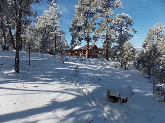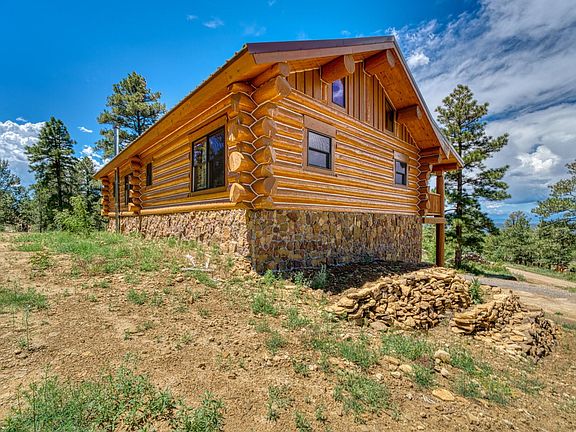 An amazing opportunity on a top-shelf mountain view property in Santa Fe Trail Ranch just 20 minutes from downtown Trinidad, Colorado! A true log home built in 2018 with massive white pine beams and vaulted tongue and groove ceilings tucked in the tall pines. Walk-out basement on ground level has plenty of storage space, a drive-in garage, wood burning stove and half bath. The 1,350 square foot main floor above offers 3 bedrooms, laundry room, a second wood burning stove and a full bath with large open great room and kitchen. Just outside is a full covered deck with a never-ending picture show set in Ponderosa pines and panoramic views at 7,500 feet. This turn key mountain home comes with water tap, cistern, metal roof, Pella windows, all appliances, complete septic system and internet!