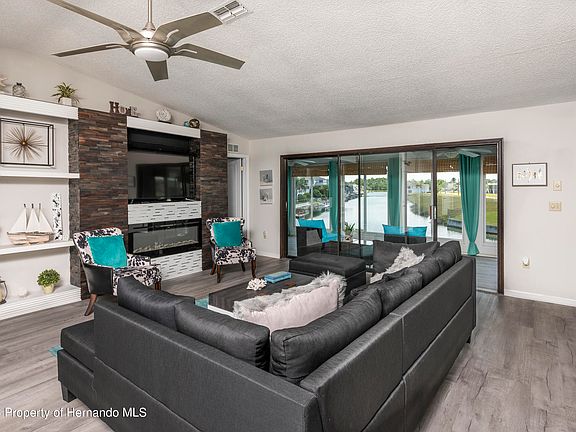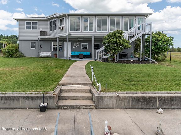Active Under Contract – Accepting Back Up Offers. Seller is motivated and offering this stunning WATERFRONT home with incredible morning views as you enjoy your coffee from your huge glass window enclosed lanai. This is the ONLY lot in Hernando Beach South that provides the private water views from the length of the canal! And it is newly renovated and MOVE IN READY! New hurricane impact windows, New paint inside and out, 18' floating boat dock, concrete sea wall, Oversized 2 car garage with ample work space. Main floor has stunning entertainment wall with custom tile, electric fireplace, beautiful kitchen, breakfast bar, formal dining room and lots of space for entertaining in the enclosed upper lanai. Take a quick ride downstairs in your yearly maintained elevator (950 lb. capacity) and arrive in your recreation/Florida room with adjacent kitchenette & 1/2 bath. Your guests will enjoy their private downstairs suite with quick access to the outdoor porch/patio. The fenced in backyard leads you to your fun filled adventures from your dock through the lift station where the Gulf of Mexico awaits you! The community also provides residents with a Boat Launching Ramp.