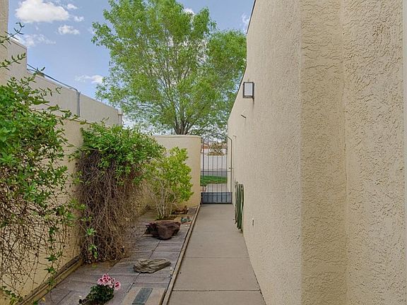Welcome to the Esplanade!Wonderful 55+ community nestled in the heart of Rio Rancho. This home is on the exterior of the community and backs to a nice greenbelt. Landscaped courtyard welcomes you to the home. Updated kitchen offers newer appliances, abundant storage, refaced cabinetry, new counter tops, breakfast nook, family dining room(could serve as office) & formal dining room. Two generous living spaces separated by custom fireplace w/heat and glow feature and beamed ceilings. New ceiling fans and plumbing fixtures. Step out to the sunroom flooded with natural light for dining, hobby or exercise room. Updated laminate flooring graces the common area of the home. Second bedroom offers additional storage room and access to garage as well. Large laundry room w/ample storage and sink.