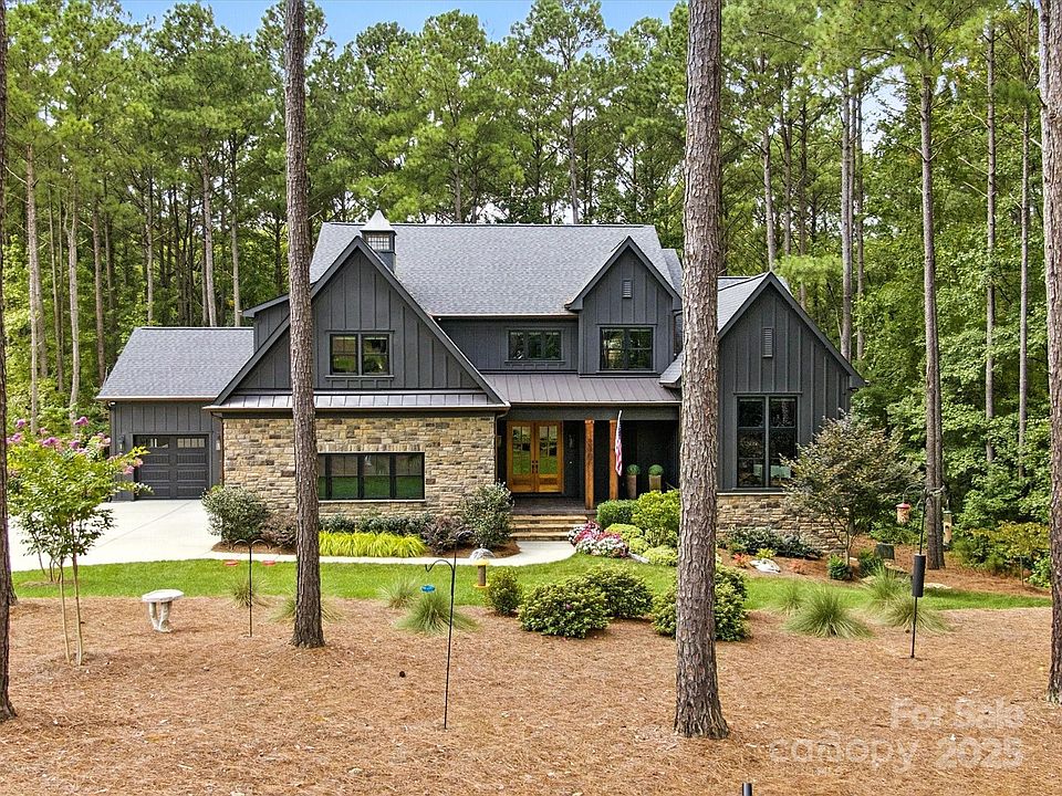 Discover a rare blend of luxury, technology, and natural beauty in this custom estate with 4,300+ sq ft plus a walkout basement ready for expansion. From the mahogany double doors to the white oak floors, craftsmanship shines at every turn. The designer kitchen boasts Monogram appliances, quartz counters, a mercury glass backsplash, and a walk-in pantry with a second dishwasher. The great room with coffered ceiling opens through stacked sliders to a screened porch, creating seamless indoor-outdoor living. The main-level primary suite impresses with cathedral ceiling, custom closets, and a spa-style bath with heated floors. Two dedicated offices, smart home automation, whole-house generator, oversized garages, and nearly an acre backing to protected woods complete the package. Neighborhood amenities include pool, clubhouse, pickleball, trails, and river access—just 30 minutes to Ballantyne and minutes to Costco, dining, and shopping.