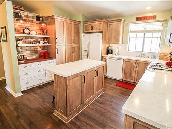 Beautifully remodeled Wildomar single story home. Showpiece kitchen with cappuccino colored, cherrywood, soft close cabinets and full extension, dovetailed drawers; granite composite undermount sink and Silestone quartz counter tops. Designers touch bakers corner with vanity height, Boos walnut butcher block and floating shelves. 3 bedrooms and 2 bathrooms with living room dining area great room round out the interior. While the bedrooms are carpeted, the rest of the home offers oak colored, 7" plank, wat