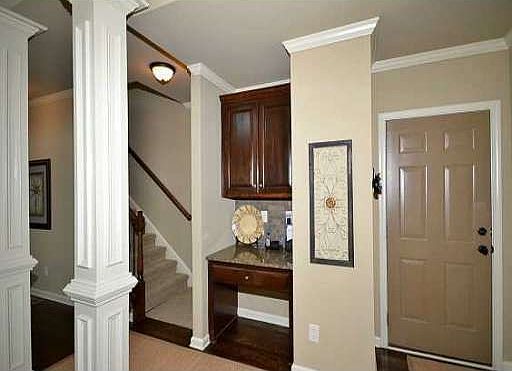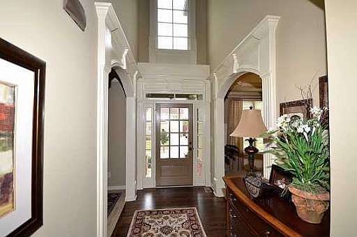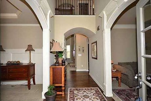 - Interior: 10 ft+ Ceil Main, 2-Story Foyer, Double Vnty Other, Entrance Foyer, Trey Ceilings, Wall/Wall Carpet, Bookcases, Disp Attic Stairs, 10 ft + Ceil Upper