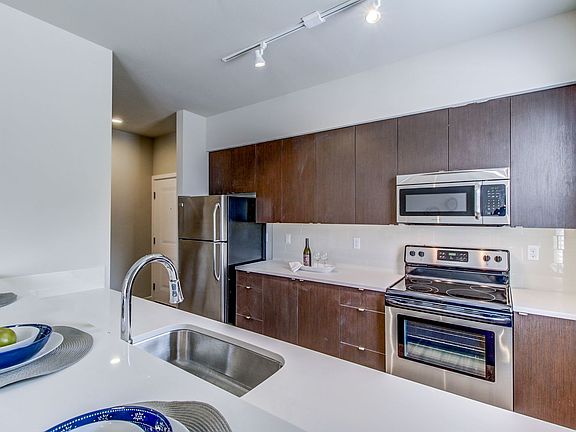 Our designer kitchens feature modern European style cabinetry, sleek quartz slab countertops throughout, and stainless steel appliances with glass flat top stove and extra-large single basin sink with faucet sprayer.