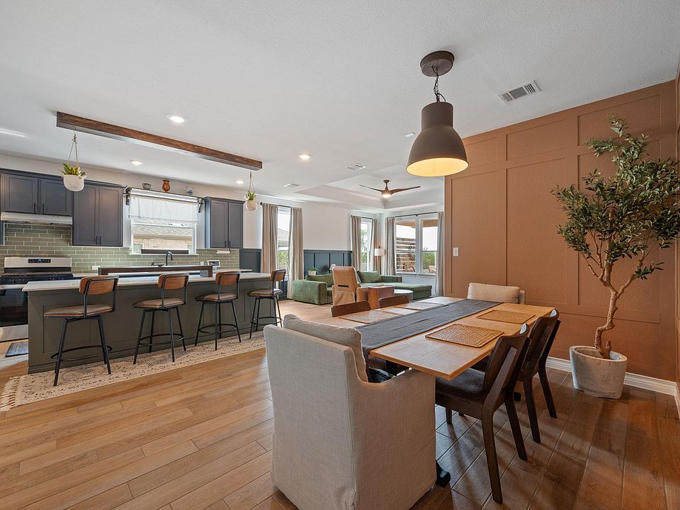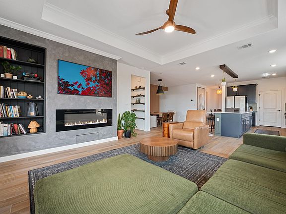 This single-story home offers 3 bedrooms, 2 baths, and a dedicated office, thoughtfully updated with premium finishes throughout. Inside, you’ll find elegant tile flooring, custom wall trim, designer paint, and upgraded light fixtures and fans that add warmth and character to every space. The living room features an electronic fireplace framed by built-in bookshelves, while the kitchen showcases a country-inspired beam above the island, upgraded cabinetry, and stylish design details. Additional enhancements include a framed wallpaper mural, upgraded guest bath mirror, curtain rods throughout, a wooden-trimmed office entryway, and an expanded garage plan complete with chalkboard paint and a Wi-Fi–enabled HVAC controller. Outdoor upgrades extend the living space with a large stained wood deck, perfect for enjoying the dark sky community views, as well as organic garden beds, rock landscaping, decomposed granite for water efficiency, a privacy fence, and a hammock set beneath sturdy stained posts. The back porch also offers hot and cold water hookups, while the front features a glass door with upgraded insertion and an automatic smart lock. Set against a greenbelt with open views, this home combines modern style, energy-conscious improvements, and thoughtful design in every detail.